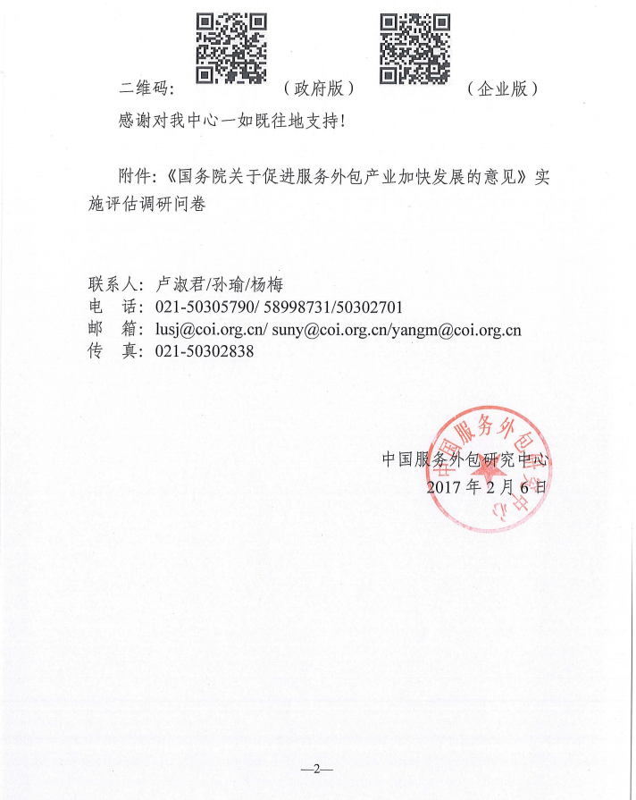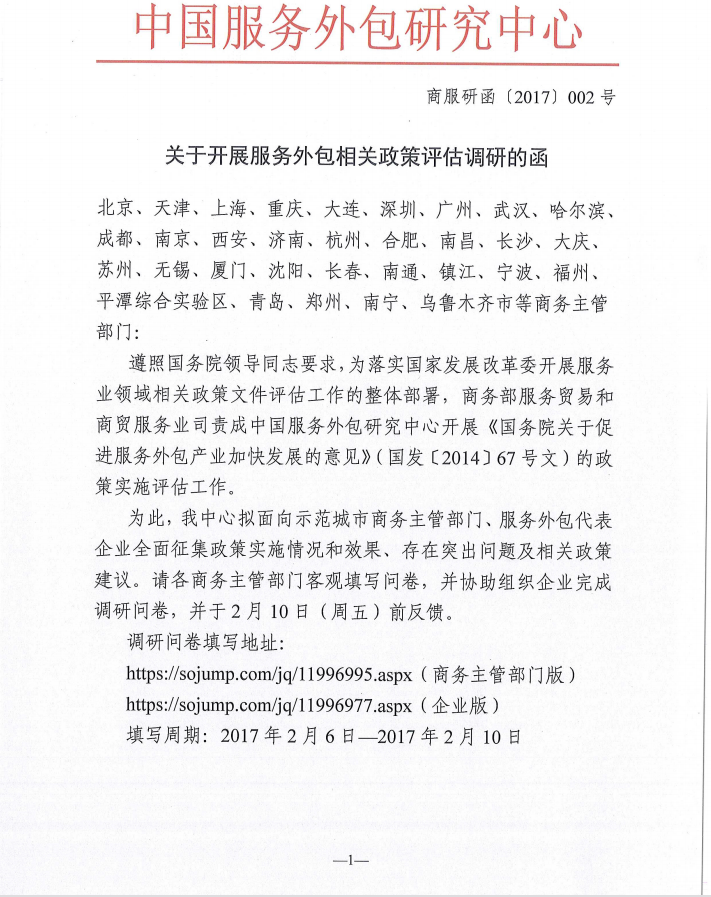 關(guān)于開展服務(wù)外包相關(guān)政策評(píng)估調(diào)研的函