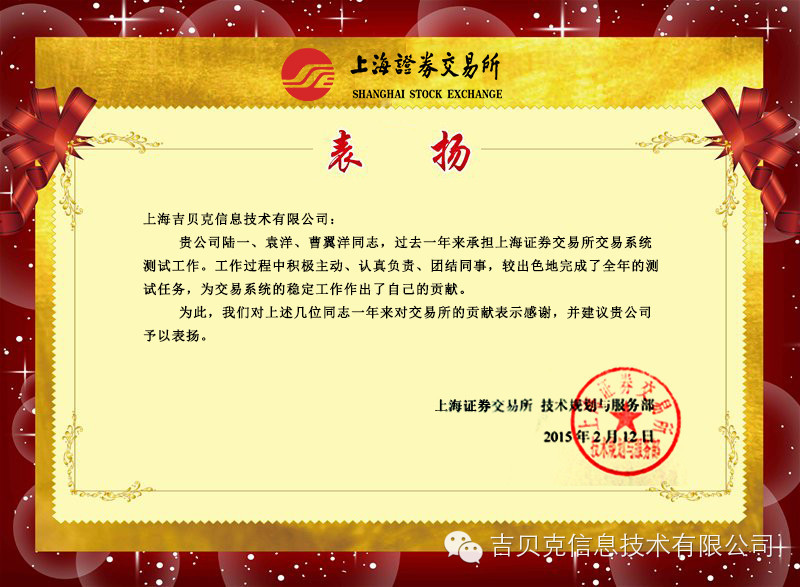 近日,吉貝克喜獲上海證券交易所的表揚信。上證所高度肯定了吉貝克團隊的工作成績。吉貝克在2014年承擔上證所的交易系統(tǒng)測試工作,以嫻熟的技術、優(yōu)質(zhì)的服務為前提,以為客戶創(chuàng)造最高價值為己任,嚴把產(chǎn)品質(zhì)量,為交易系統(tǒng)的穩(wěn)定運行做出了突出的貢獻。信中特別點名表揚了我司陸一、袁洋、曹翼翔同志,稱贊這三位同事積極主動、認真負責、團結同事。